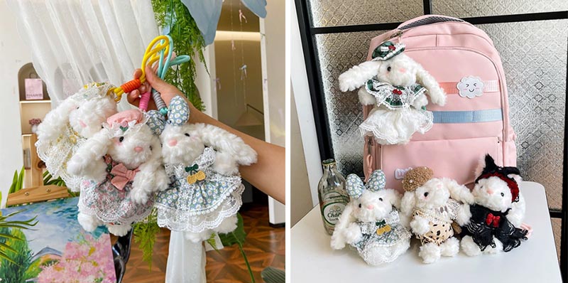 คุณสามารถซื้อกระต่ายธรรมดาซึ่งมาโดยไม่มีอุปกรณ์เสริมหรือเครื่องแต่งกาย พวงกุญแจสัตว์ที่หรูหราของเรามีสไตล์ที่หลากหลาย พวกเขาสามารถจับคู่กับเสื้อผ้าและอุปกรณ์เสริมหลากหลายประเภทและมีตัวเลือกที่หลากหลายมาก เครื่องประดับที่แขวนไว้หรูหรานี้เป็นที่รักของทั้งเด็กและเด็กผู้หญิงหลายคน